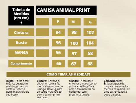 A Camisa Animal Print é a peça-chave para quem deseja um visual moderno e cheio de personalidade. Confeccionada em tecido leve e de caimento impecável, apresenta estampa clássica de oncinha que nunca sai de moda. Possui modelagem soltinha, gola tradicional e fechamento frontal por botões, garantindo versatilidade para compor looks casuais ou sofisticados. Ideal para usar com alfaiataria, jeans ou saias, elevando instantaneamente qualquer produção.