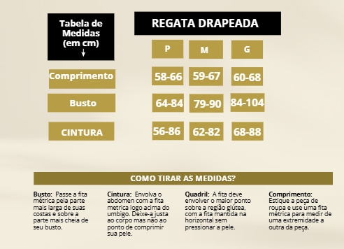 Elegante e moderna, a regata drapeada é a escolha certa para destacar qualquer produção. O detalhe drapeado valoriza o busto e a silhueta, trazendo sofisticação na medida certa. Confeccionada em tecido confortável e com ótimo caimento, é versátil para compor tanto looks casuais quanto produções mais refinadas.