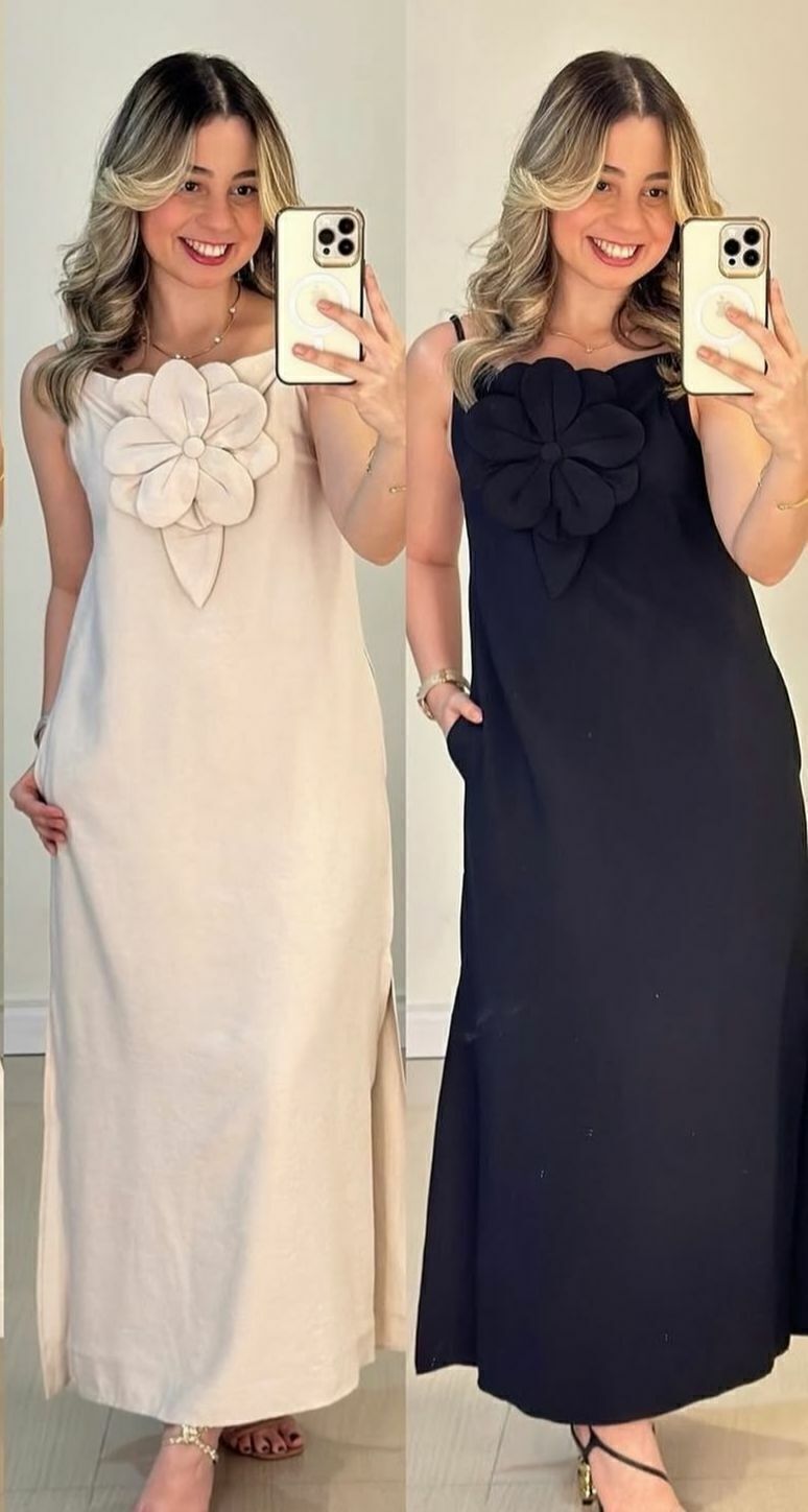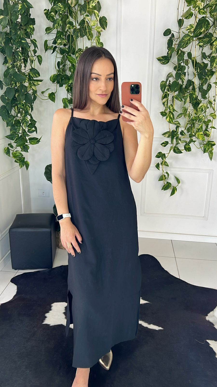 Esse vestido longo preto é a escolha perfeita para quem ama sofisticação com personalidade. Com modelagem reta e alças finas, o destaque fica por conta da flor em 3D aplicada no busto — um detalhe imponente e delicado ao mesmo tempo.